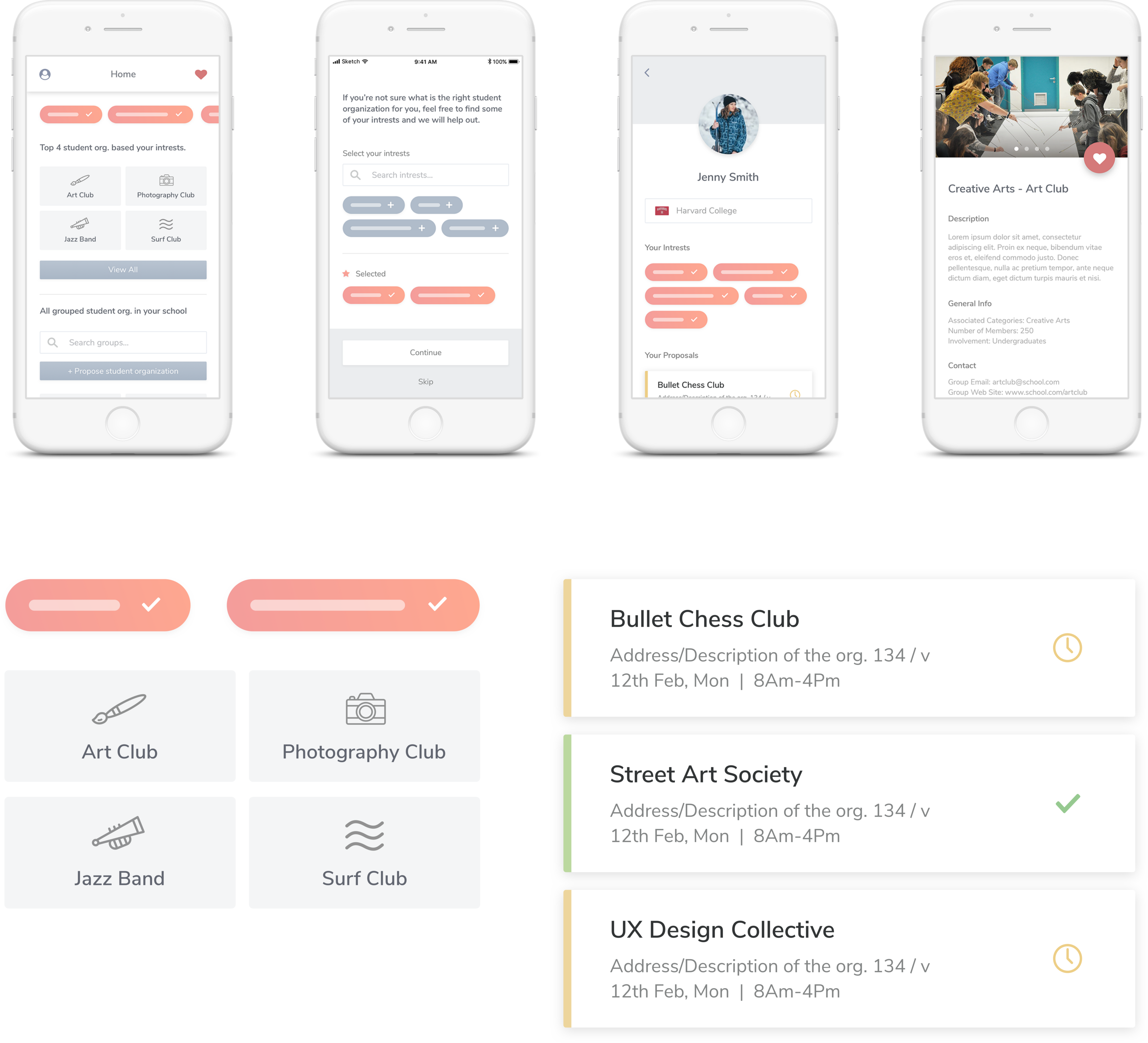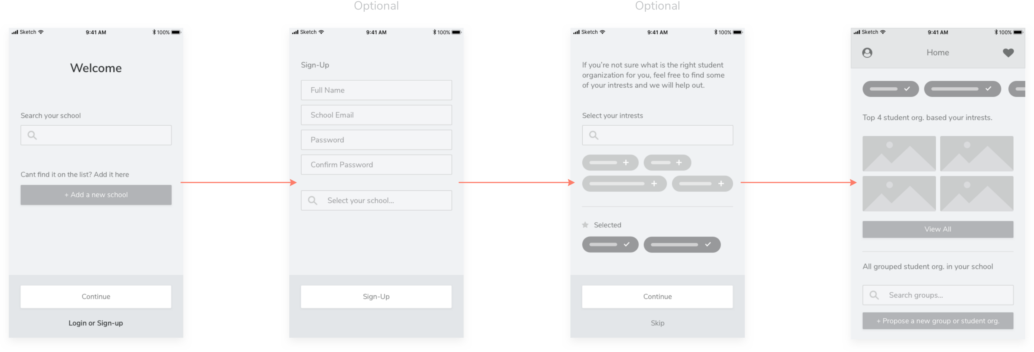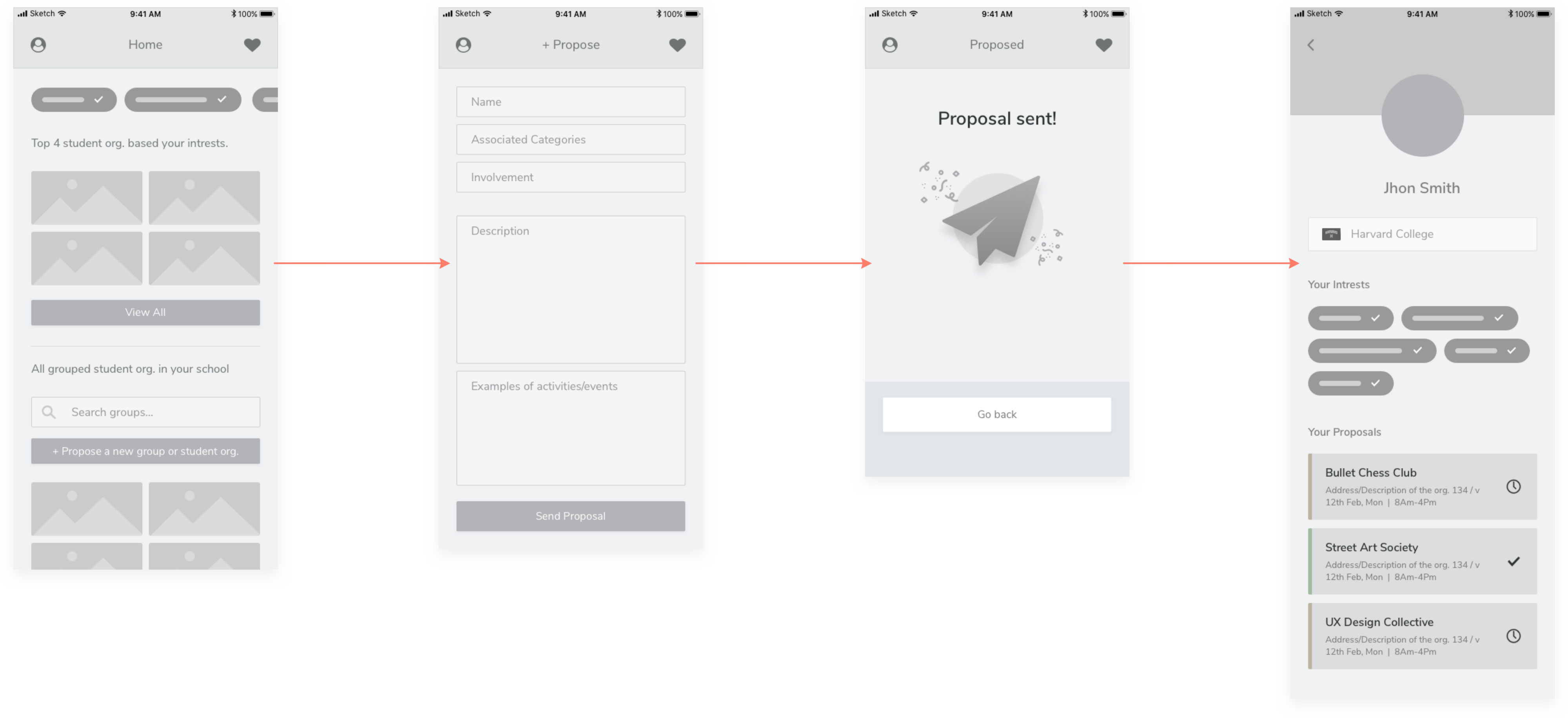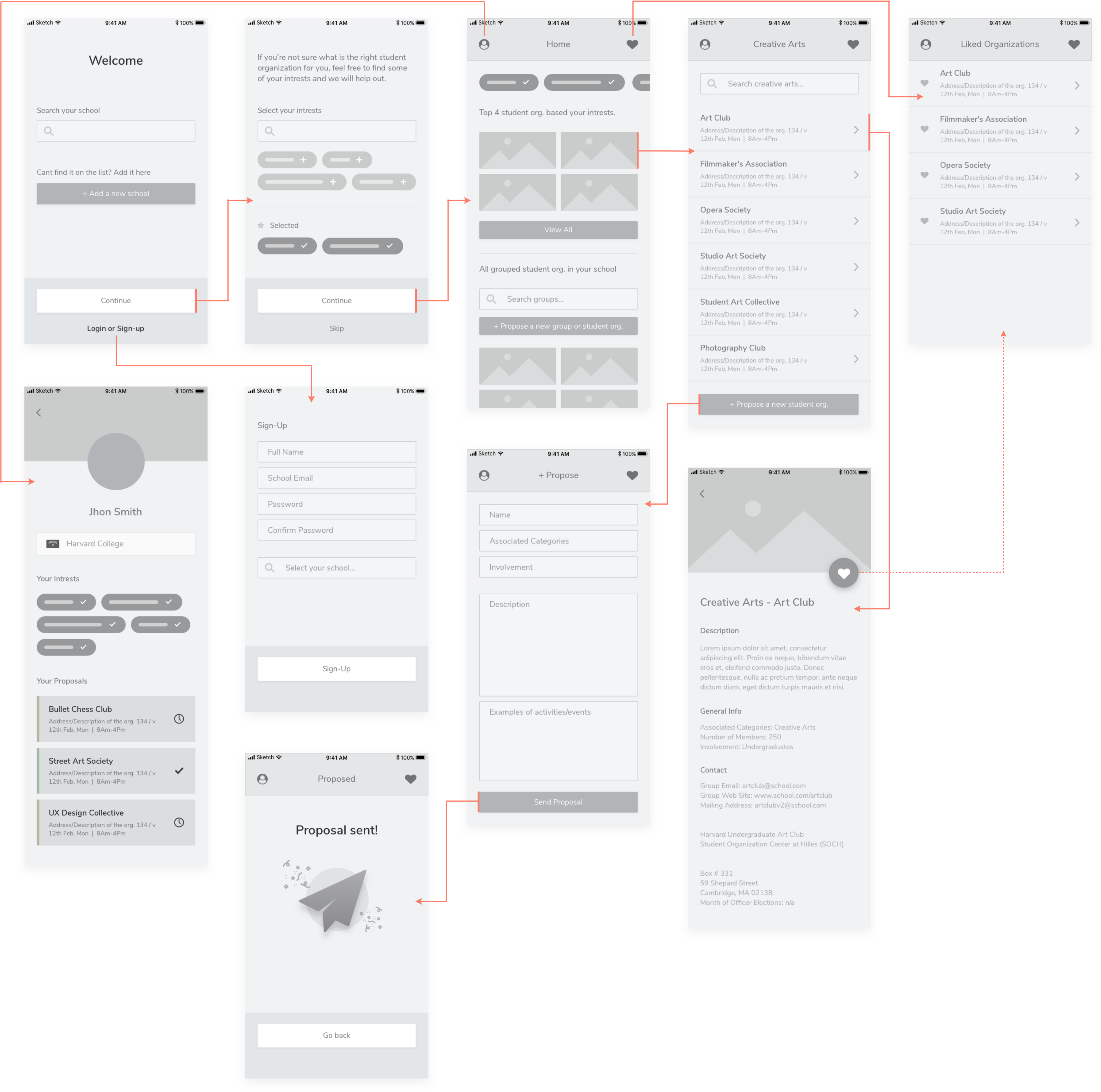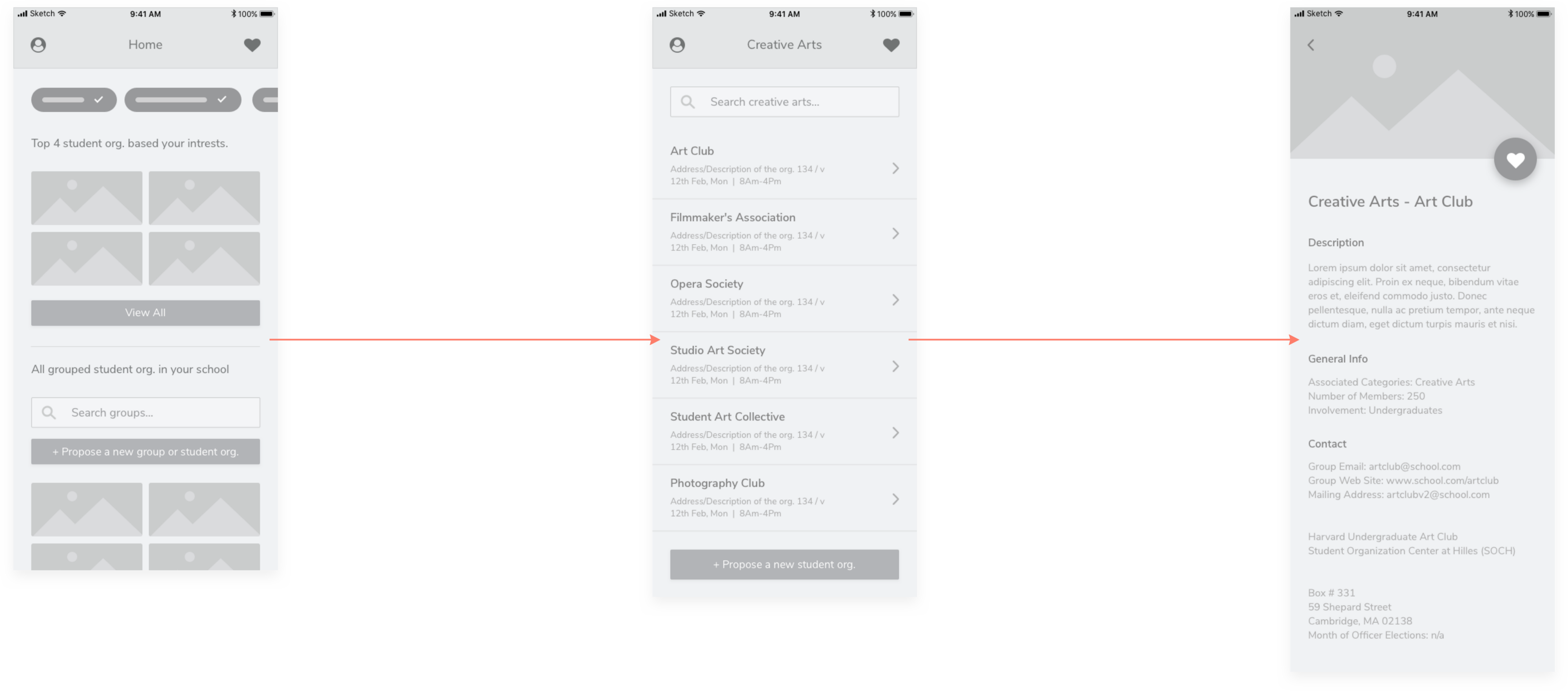 Design an experience for new students to browse, search, and propose new student organizations. Provide your overall process, a wireframe flow, and one to two screens at higher fidelity.
