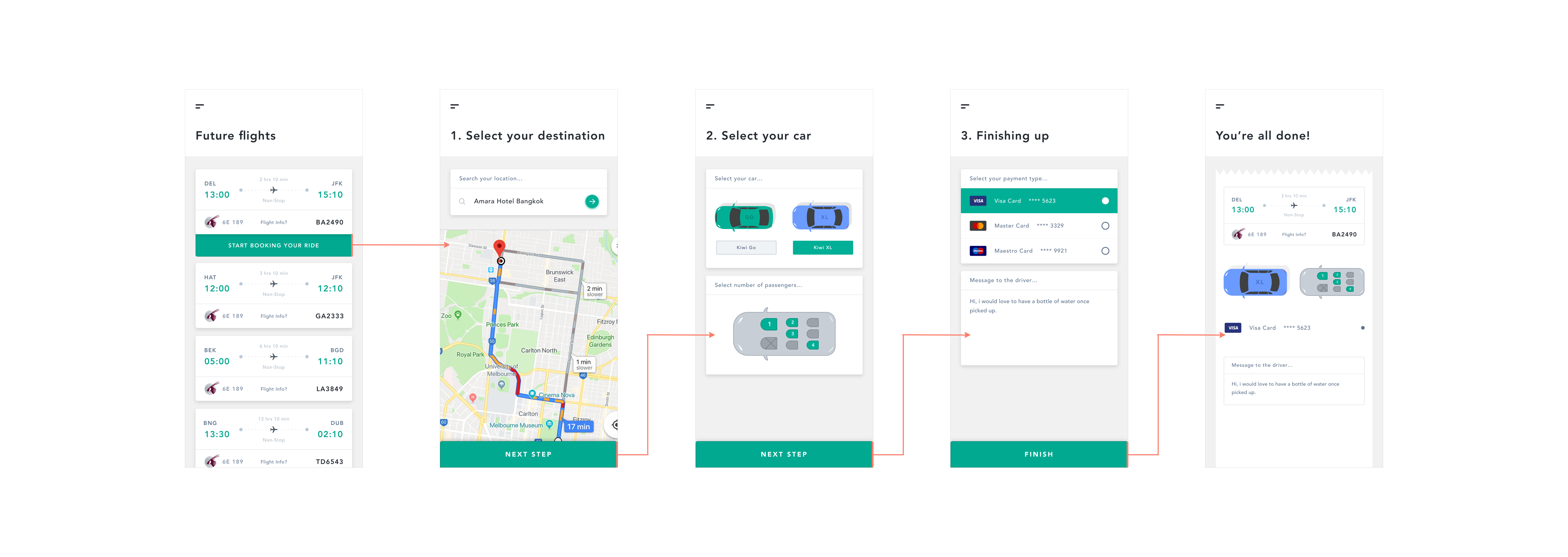 3. That's it! You're all done, the last screen is made for the user to select his payment method and leave a message for the driver if he has any special requests.